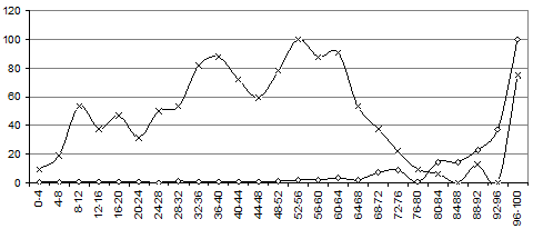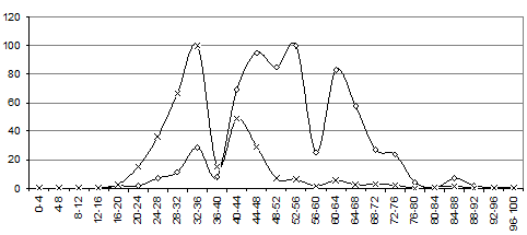 На рис. 7 приведены графики кривых распределения заявок подрядчиков. Видно, что в экспертной модели хуже разделяются распределения плохих и хороших заявок, но в тендерной карте нечеткой экспертной системы большое число плохих заявок сконцентрировано в верхнем диапазоне оценочного балла.