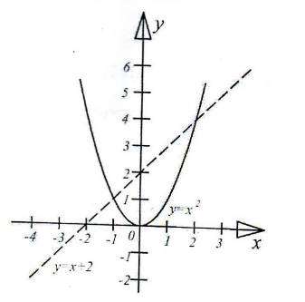 Решение. Строим график функций у=х2 и у=х+2. Корнями являются абсциссы точек пересечения (-1;1) и (2; 4), т. е. -1 и 2