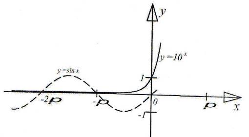 Решение. После построения графиков функций у=10х и у= sin x легко заметить, что уравнение имеет бесчисленное множество решений. Значения корней близки к хк=-πк, где к=1,2…