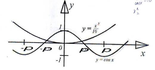Сколько решений имеет уравнение х2/cos x= cos x с таким расчетом, чтобы графики было удобно построить. Строим графики левой и правой частей. Видим, что уравнение имеет 2 решения.