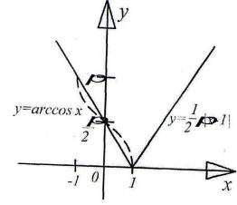 Решение. Отметим, что функция у= arсcos x определена лишь на отрезке -1≤х≤1, поэтому вне этой области решений исходного неравенства быть не может. Решением являются совокупность тех значений х, при которых график функции у= arсcos x проходит ниже графика у=1/2π x-1; кроме того, в решение войдут и значения абсцисс точек пересечения двух графиков, так как мы имеем дело с нестрогим неравенством. Из рассмотрения графиков находим решение -1≤х≤0, х=1.