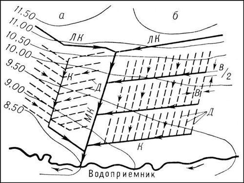 На рис. 2 — дренажные системы. Вода, поступившая в дрену, движется от истока её к устью, для чего дренажными линиям (не длиннее 150—200 м) придают уклон не менее 0,002. Из дрен вода поступает в открытые или закрытые (из труб) коллекторы (длина их не более 1000 м), а оттуда сбрасывается в магистральный канал и удаляется за пределы осушаемой территории.