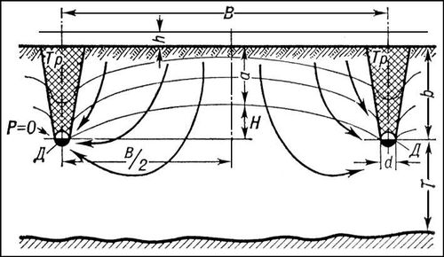 Дрены при расстоянии между ними В (в м), глубине заложения b (в м) и диаметре d (в м) должны за t суток после снеготаяния отвести поступившие в почву талые воды и понизить поверхность грунтовых вод до нормы осушения а (в м); Н — запасы воды в снеговом покрове (в м3/га); Т — глубина залегания поверхности водоупора (в м); Д — дрены; Тр — траншеи; Р — давление, условно принимаемое за нуль. Обычно b принимают для минеральных почв = 1,1 м, для торфяников = 1,3—1,5 м. Расстояние между соседними дренами (в пределах 15—50 м) определяют по формуле: