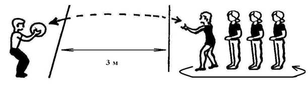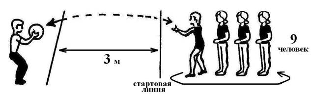 Описание эстафеты: По сигналу судьи капитаны одновременно выполняют бросок мяча впереди стоящим игрокам в своих командах. Поймав мяч, игрок выполняет бросок обратно капитану, а сам занимает место в конце колонны. Затем капитан бросает мяч второму игроку и, получив его обратно, - третьему и так далее по порядку. Передав мяч капитану, каждый играющий убегает в конец колонны.