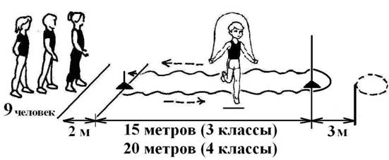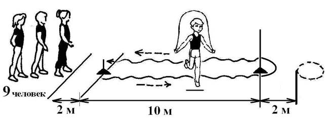 Инвентарь: для каждой команды - одна скакалка, две фишки (стойки), один обруч.