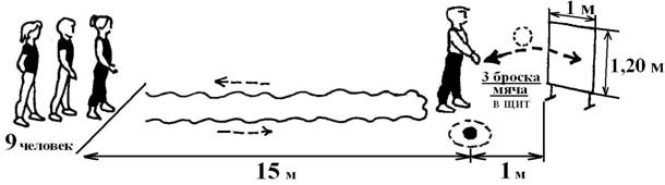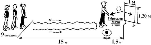 Подготовка к эстафете: Игроки стоят в колонне за стартовой линией. Перед каждой командой на расстоянии 15 метров находится обруч, в котором лежит баскетбольный мяч. В 1,5 метрах от обруча впереди устанавливается щит.