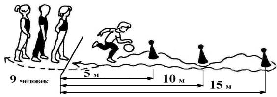 Подготовка к эстафете: Игроки стоят в колонне за стартовой линией. Перед каждой командой на расстоянии 5, 10 и 15 метров находятся 3 фишки (стойки).
