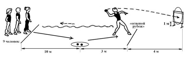 Подготовка к эстафете: Игроки стоят в колонне за стартовой линией. Перед каждой командой на расстоянии 10 метров находится обруч, в котором лежат 3 теннисных мяча. В 3-х метрах от обруча впереди чертится линия – это «огневой рубеж». Далее на расстоянии 3-х метров от «огневого рубежа» располагается мишень-экран.