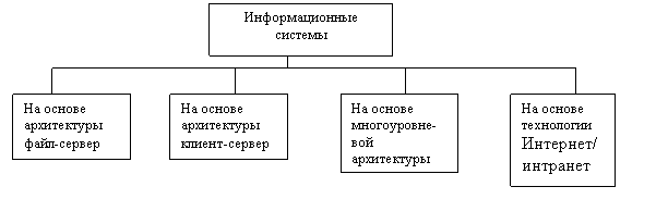 - системы на основе архитектуры файл-сервер; системы на основе архитектуры клиент-сервер; системы на основе многоуровневой архитектуры; системы на основе Интернет/интранеттехнологий.