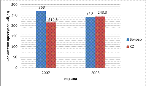 Наблюдается отрицательная динамика роста числа зарегистрированных преступлений. Эта тенденция характерна для города Белово, в то время как в области в целом происходит рост преступлений в анализируемом периоде.(рис 19).