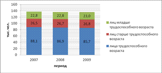Снижается численность трудоспособного населения с одновременным ростом числа населения старше трудоспособного и младше трудоспособного возраста, что в свою очередь влечет за собой увеличение нагрузки на трудоспособное население. Число лиц категории «старше трудоспособного возраста» за период г. г. увеличилось с 26,5 тыс. чел. в 2007г. до 26,8 тыс. чел. в 2009г. (+0,8%), число лиц категории «младше трудоспособного возраста» увеличилось в 2009 году на 0,9% по сравнению с 2007 годом. При этом число лиц категории «трудоспособного возраста» сократилось в 2009 году на 2,7% по сравнению с 2007 годом.