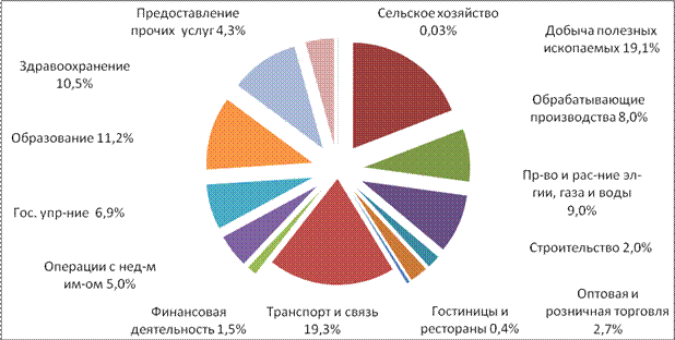 Структура занятости отражает специфику города и его место в региональном разделении труда. Основную долю по г. Белово составляют занятые на транспорте (19,3%) и добычей полезных ископаемых (19,1%). (рис. 6).