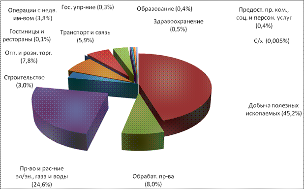 Как видно из рис. 8, в отраслевой структуре оборота организаций города Белово доминирует добыча полезных ископаемых (45,2%), на долю деятельности по производству и распределению электроэнергии, газа и воды приходится 24,6%. Таким образом, около 70% оборота приходится на топливную отрасль и электроэнергетику.