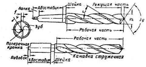 Основными элементами спирального сверла являются следующие: