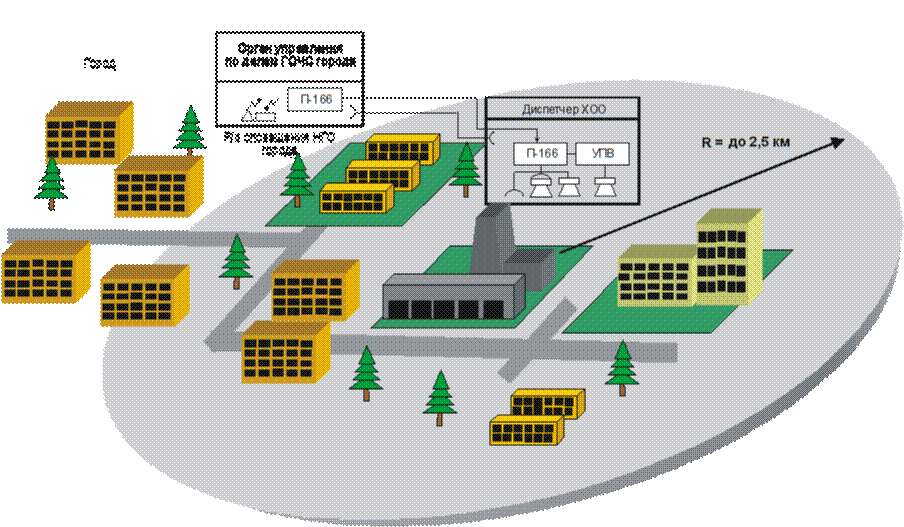 в районах размещения химически опасных объектов – в радиусе до 2,5 км вокруг каждого из объектов;