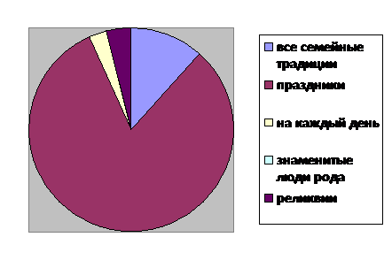 На основании проведенной анкеты [2] среди учащихся школы МКОУ СОШ № 21 мы выяснили, что ученики мало знают свои семейные традиции. Но имеет место потребность выработать свои собственные, помогающие людям чаще собираться вместе, чтобы чувствовать себя настоящей семьёй. В эпоху быстрых перемен, люди стремятся к чему-то новому, пытаются уйти от традиционности, избавится от устоев, как от пережитков прошлого, чего-то ненужного, потерявшего смысл…Но всегда ли то, что имело особое значение на протяжении столетий, утрачивает свою ценность в современном мире? И как же значимы русские традиции для семьи?