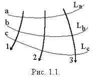 Из векторного анализа известно, что вектор градиента всегда ортогонален поверхности уровня функции, т. е. поверхности, на которой функция постоянна. В данном случае поверхность уровня для эйконала представляет собой волновой фронт, следовательно s – орт нормали к волновому фронту. Исходя их уравнений Максвелла можно показать, что направление вектора Пойнтинга, определяющего перенос энергии света, совпадает с вектором s. Таким образом, линии вектора s представляют собой геометрические световые лучи. Рис. 1.1 иллюстрирует тот факт, что семейство волновых фронтов (a, b, c) и семейство световых лучей (1, 2, 3) образуют ортогональную (в общем случае криволинейную) сеть.