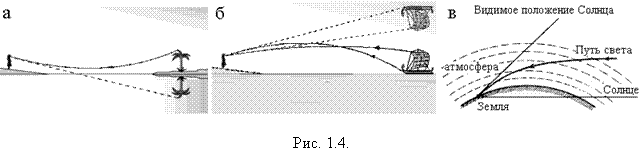 Эффект атмосферной рефракции возникает из-за искривления световых лучей при наклонном прохождении верхних слоев атмосферы (рис. 1.4в). Благодаря этому Солнце остается видимым еще некоторое время после ухода под горизонт, а видимые положения небесных светил смещаются относительно истинных в сторону зенита.