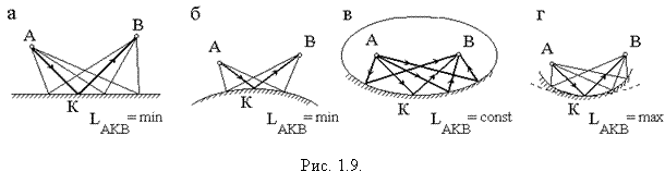Иллюстрация применения принципа Ферма к отражению света от поверхностей различной кривизны показан на рис. 1.9. Нетрудно доказать, что для плоской (рис. 1.9а) и выпуклой (рис. 1.9б) поверхностей из всех возможных траекторий АКВ, соединяющих точки А и В, таких, что точка К лежит на зеркале, наименьшую длину, имеет та, для которой угол падения равен