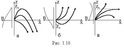На рис. 1.10 показано распространение лучей, испущенных точечным источником, помещенным в плоско-слоистую среду. Рис. 1.10а соответствует случаю убывания функции n(z), 1.10б – возрастанию, а 1.10в – наличию минимума показателя преломления. Если луч распространяется в сторону уменьшения показателя преломления, он может углубиться в среду только на определенное расстояние, дойдя до точки поворота zп. Поскольку в точке поворота луча q = p/2 и sinq = 1, то zп определяется из соотношения