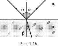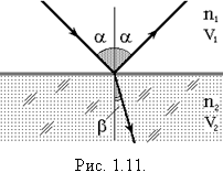 При прохождении через такую границу раздела свет испытывает отражение и преломление (рис. 1.11). Рисунок соответствует ситуации, когда показатель преломления первой среды меньше, чем второй (n1 < n2), а, следовательно, скорость света в первой среде больше (V1 > V2). Взаимное расположение лучей описывается законами отражения и преломления света на границе раздела. Эти законы подробно обсуждаются далее (см. Оптика, ч. 3, разделы 5.1…5.3), поэтому здесь приведем только основные формулировки.