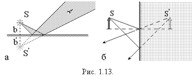 падающим на границу раздела лучом и нормалью к границе, проведенной в точке падения луча (рис. 1.12). Углы между лучами и нормалью равны между собой: угол падения a равен углу отражения b. Установление этого закона связано с употреблением полированных металлических поверхностей (зеркал), известных уже в очень отдаленную эпоху. Построение изображения точечного источника S в плоском зеркале приведено на рис. 1.13а. В результате отражения формируется мнимое изображение S¢ источника, т. е. изображение, возникающее в точке пересечения продолжений отраженных лучей. Расстояние от зеркала до изображения b¢ равно расстоянию от источника до зеркала b.