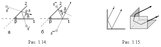 Построение изображений в скрещенных зеркалах представлено на рис. 1.14. При отражении источника S в зеркале 1 образуется изображение S¢, которое, в свою очередь, служит источником для изображения S² в зеркале 2 (рис. 1.14а). С другой стороны, начиная построение с зеркала 2, получим изображения S²¢ и S²² (рис. 1.14б). Можно показать, что сам источник S и все формирующиеся изображения лежат на дуге одной окружности с центром в вершине зеркального угла. Кроме того, из простых геометрических соображений очевидно, что угол d между направлениями лучей до и после отражения от двух зеркал равен удвоенному углу между зеркалами: