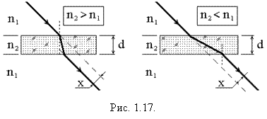 При прохождении луча сквозь плоскопараллельную пластинку направление прошедшего луча света совпадает с направлением падающего, однако луч смещается параллельно самому себе. Расстояние х, измеренное в направлении, поперечном лучу, носит название смещения луча (рис. 1.17). Оно пропорционально толщине пластинки d и зависит от ее показателя преломления.
