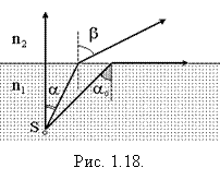 Правильная формулировка этого закона принадлежит Снеллиусу и доказывается принципом Ферма. Иллюстрацией этого принципа может служить первая задача к данному разделу. Согласно закону Снеллиуса (см. рис. 1.16), луч преломленный лежит в плоскости падения, а синусы углов падения и преломления связаны соотношением