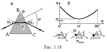 Зависимость угла отклонения s от угла падения лучей на призму показана на рис. 1.19б. Угол отклонения становится минимальным при симметричном ходе лучей (a1 = a2), в этом случае зависимость угла минимального отклонения от показателя преломления вещества призмы и преломляющего угла определяется выражением: