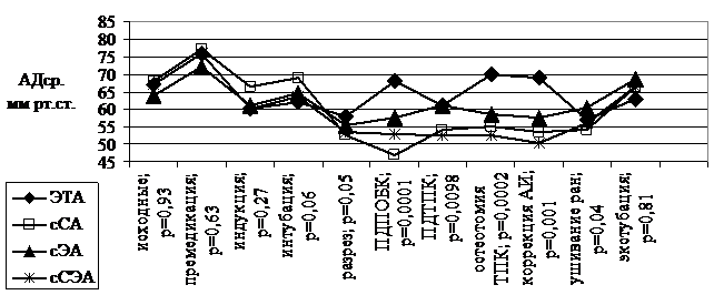 Показатели гемодинамики. При сравнительном анализе динамики АДср. в исследуемых группах было установлено статистически значимое различие значений АДср. на травматичных этапах операции. Значение АДср. было достоверно ниже в группах II и IV при сравнении с группой I. Максимальное снижение АДср. в группах II и IV наблюдалось на этапе поднадкостничного доступа к проксимальному отделу бедренной кости (ПДПОБК), и достигало значения; 57) мм рт. ст. в группе II и; 57) мм рт. ст. в группе IV, что было ниже исходного значения на 31,6 (17,3; 32,9) % и 23,5 (18; 29,6) % соответственно (p=0,005 и p=0,0001). В течение операции значения АДср. в группах II и IV оставались стабильными и достоверно не различались. К концу операции значение АДср. составило; 58) мм рт. ст. в группе II и; 60) мм рт. ст. в группе IV, что было достоверно ниже исходного значения на 19,4 (14,3; 25,4) % и 17,5 (5,4; 25,2) % соответственно (p=0,005 и p=0,0001). При сравнении АДср. в группах I (ЭТА) и III (сЭА) статистически значимых различий не выявлено. При сравнении значений АДср. между группами II и III статистически значимых различий на травматичных этапах операции не выявлено, а при сравнении групп III и IV, АДср. было достоверно ниже в группе IV на этапах ПДТПК, остеотомии тела подвздошной кости (ТПК) и коррекции ацетабулярного индекса (АИ) (рисунок 1, таблица 3).
