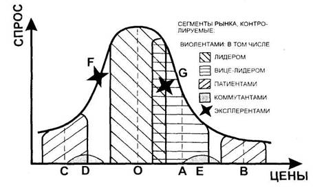 Макроэкономическим следствием такого сочетания стимулов и анти-стимулов, действующих на фирмы, является тенденция к равномерному освоению всего рыночного пространства фирмами-конкурентами. На нашем рисунке не занятое никем рыночное пространство в левой части графика распределения спроса, наверняка будет привлекать патиента С; коммутанта Д (для которого смещение на этот сегмент рынка вдвойне важно, поскольку позволит избавиться от пересечения реализованных ниш с могущественным виолентом О): и даже для лидера отрасли О. Очевидно, что в реальной жизни такой сегмент рынка не будет долго пустовать.