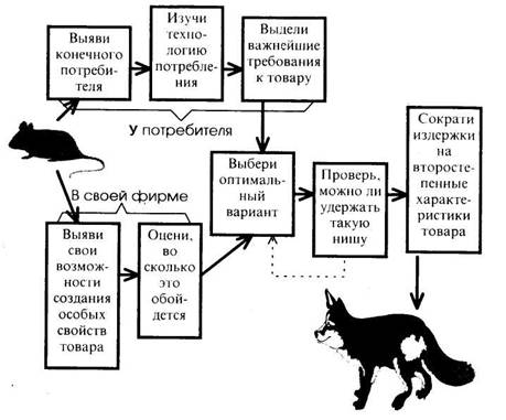 Если история (как, скажем, многовековой опыт чаеторговли фирмы «Липтон») или технология (какое-нибудь нововведение) не «подарили» патиенту нишу в готовом виде, то сферу специализации приходится создавать самому, постепенно изменяя в этом направлении обычные товары, выпускаемые фирмой. М. Портер предлагает для этого следующую последовательность действий:
