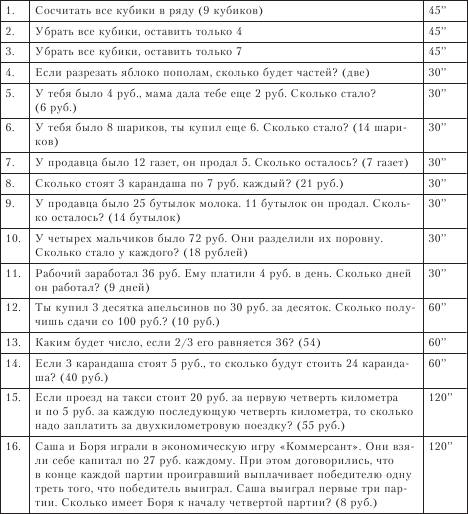Примечание.Задания № 1–3 выполняются на кубиках. Задания № 14–16 даются испытуемому на карточках. Испытуемый читает задачу сам, обязательно вслух. Секундомер включается по окончании чтения. Если испытуемый не запомнил задачу, то по его просьбе можно повторить вопрос, но время отсчитывается с момента первого прочтения.