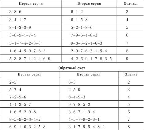 5. Предложить первый ряд первой серии. При удаче дать следующий ряд этой серии. При неудачном воспроизведении какого‑либо ряда первой серии дать аналогичный по длине ряд второй серии. В случае правильного его воспроизведения предложить следующий ряд первой серии. При неправильном воспроизведении двух одинаковых по величине рядов первой и второй серий при прямом счете – перейти к обратному, при обратном – прекратить.