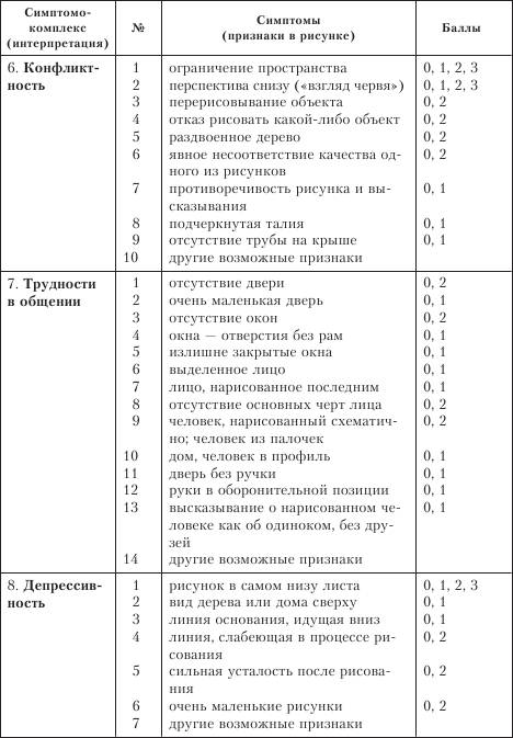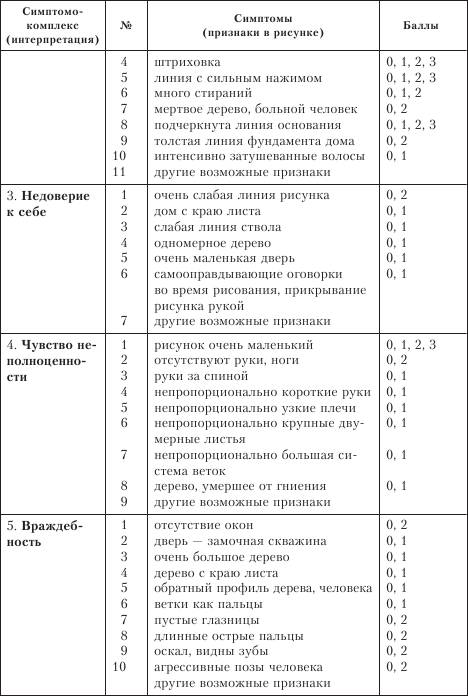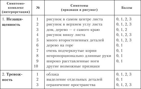 Каждый симптомокомплекс состоит из ряда показателей, которые оцениваются баллами. Если показатель отсутствует, то ставится О во всех случаях. Присутствие некоторых признаков оценивается в зависимости от их выраженности. Так, наличие облаков на одном рисунке – 1 балл, на двух – 2, а на всех – 3 (симпто мо комплекс «Тревожность»). При наличии большинства признаков ставится 1 или 2 балла в зависимости от значимости данного признака в интерпретации отдельного рисунка или всей целостности рисунков теста. Например, отсутствие основных черт лица (глаз, носа и рта) – 2 балла (симптомокомплекс «Трудности в общении»). Факт изображения человека в профиль в том же симпто мо комплексе – 1 балл. Выраженность симпто мо комплекса показывает сумма баллов всех показателей данного симпто мо комплекса (табл. 3).