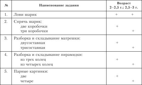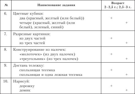 Предлагаются десять заданий, рассчитанных на обследование детей 2–2,5 лет, а также 2,5–3 лет (табл. 1).