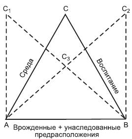 Базу образуют врожденные и унаследованные предрасположения, которые в ходе онтогенеза развиваются при посредстве внешних влияний – среды и воспитания, причем либо оптимально (равносторонний треугольник), либо, при переоценке одного или другого внешнего фактора (вершина С1 или С2), негармонично. Также возможно недостаточное развитие врожденной и унаследованной базы (треугольник А, В, С3). Эта схема демонстрирует, что ни одно слагаемое не действует независимо от других и что результирующая форма индивида зависит от их согласованности.
