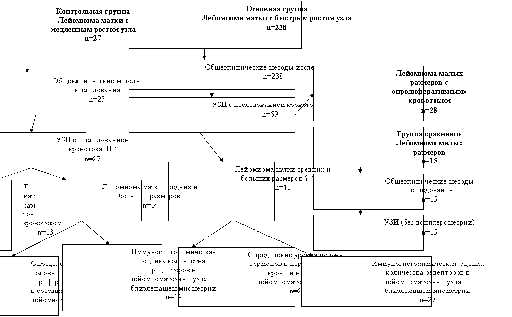 Для решения поставленных задач обследованы 280 больных с лейомиомами матки репродуктивного возраста. Основную группу составили 238 пациенток с лейомиомами матки с быстрым ростом узлов, требующих оперативного лечения. В качестве контрольной группы были выбраны 27 больных репродуктивного возраста с медленнорастущими лейомиомами матки, которая была разделена на 2 подгруппы: 13 - с малыми размерами, требующие консервативных методов лечения и 14 – со средними и большими размерами доминантных узлов, требующие оперативного лечения. Группу сравнения составили 15 пациенток с лейомиомой матки малых размеров, которым проводилась стандартная схема обследования (без допплерометрии) и лечения. Исследование было проведено в дизайне когортного открытого контролируемого (рис.1).