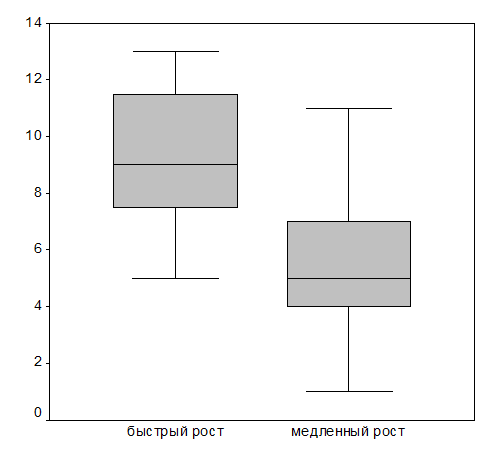 Рис. 4 Значения индекса пролиферации (экспрессия Ki-67) в миоцитах лейомиом, указывающие на наличие достоверных различий между группами с быстрым и медленным ростом при использовании непараметрического критерия Манна-Уитни (р=0,0032).