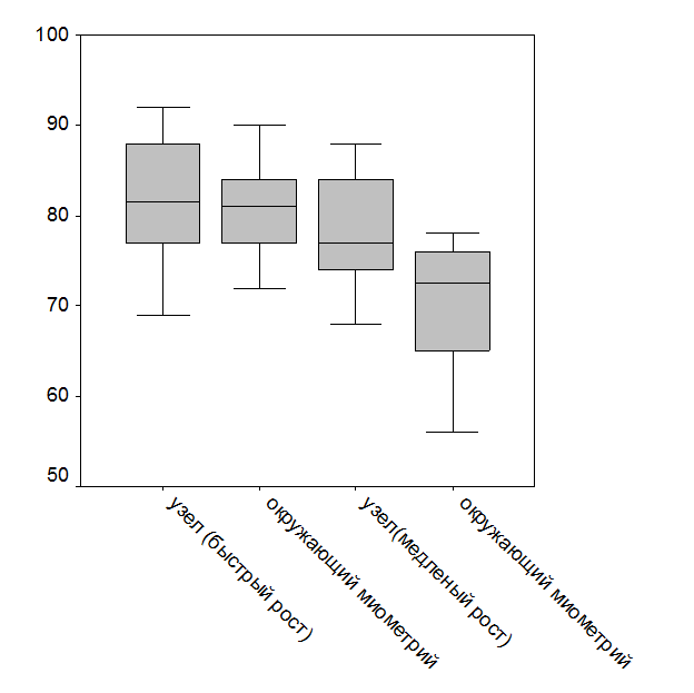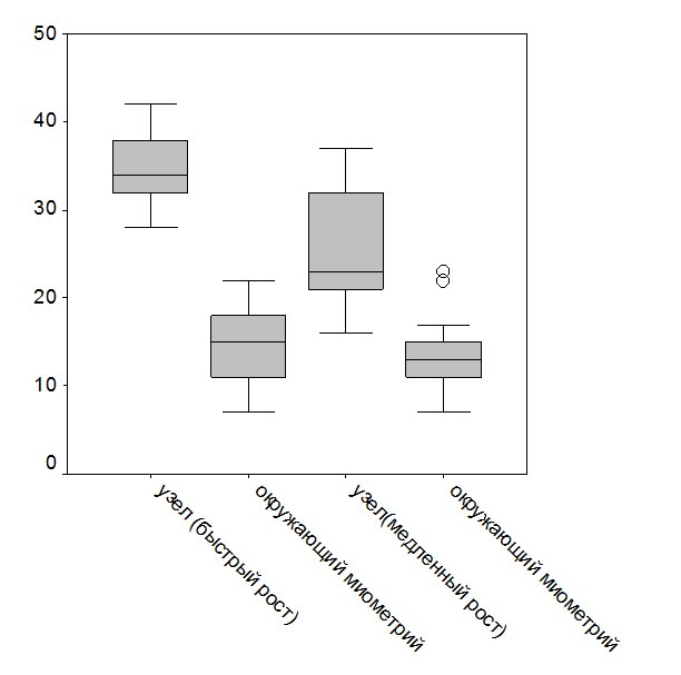 Лейомиома матки с медленным ростом узлов n=14 | Лейомиома матки с быстрым ростом узлов n=27 | ||