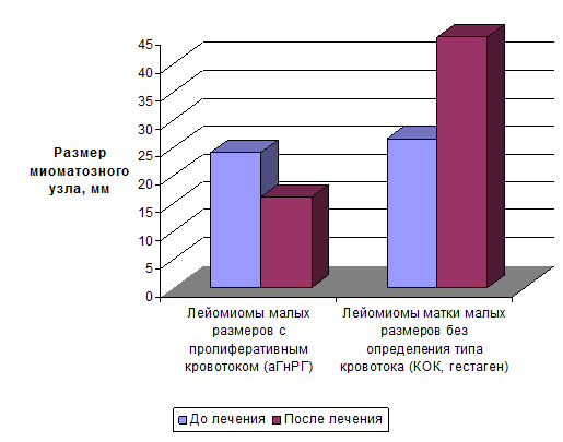Под нашим наблюдением находилось 28 пациенток репродуктивного возраста с малыми размерами лейомиомы матки и пролиферативным типом кровотока в узлах. В этой группе мы отдавали предпочтение проведению гормональной коррекции, основным направлением которой было снижение уровня кровотока в миоматозных узлах и стабилизацию роста. В качестве группы сравнения проведен анализ 15 историй болезни пациенток с лейомиомами матки малых размеров, которым проводилась стандартная схема обследования (без проведения допплерометрии) и лечения (КОК, гестагены). Размеры миоматозных узлов у пациенток с лейомиомами матки малых размеров и «пролиферативным» кровотоком (ИР=0,47±0,02) составили 2,41± 0,02, в группе сравнения – 2,66 ± 0,03.