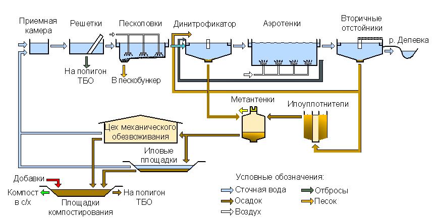 Сточные воды по напорным трубопроводам поступают в приемную камеру очистных сооружений, затем проходят механическую и биологическую очистку, поступая сначала на денитрификаторы, устроенные на базе первичных отстойников, затем в аэротенки с фазой нитрификации и вторичные отстойники. Технические возможности по очистке сточных вод очистных сооружений канализации, работающих в существующем штатном режиме, соответствуют проектным характеристикам и временным условиям сброса сточных вод в водоем.