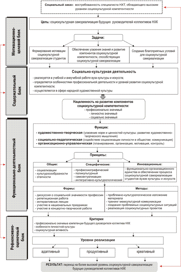 4. Разработанная структурно-функциональная модель социокультурной самореализации будущих руководителей коллективов НХК представлена взаимосвязанными и взаимообусловливающими блоками: мотивационно-целевой, содержательный, функционально-деятельностный, рефлексивно-оценочный.