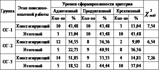 Анализируя данные результаты, можно говорить об эффективности и зна-чимости социокультурной самореализации лишь обратившись к статисти-ческим методам. Подсчитанный χ2, наблюдаемый сравнивался с χ2 табличным по группам, что позволило сделать соответствующие выводы. Критерий χ2 наблюдаемого (соответственно по группам: 7,54; 6,54; 7,26) оказался больше критерия χ2 табличного – 3,842, что свидетельствует о значимых изменениях, возникших в результате реализации педагогических условий в опытных группах. Причем, как видно из таблицы, самый большой прирост наблюдается в группе ОГ–1, в которой был реализован весь комплекс педагогических условий. Реализация в ОГ–2 первого и третьего педагогических условий дала меньший качественный прирост, нежели реализация в ОГ–3 второго и третьего педагогических условий.