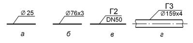 При указании номинального диаметра (условного прохода) газопроводов и их элементов на чертежах и схемах перед размерным числом приводят знак «Æ» или условное обозначение «DN» в соответствии с рисунками 2а, 2в. При указании наружного диаметра и толщины стенки перед размерным числом наносят знак «Æ» (рисунки 2б, 2г).