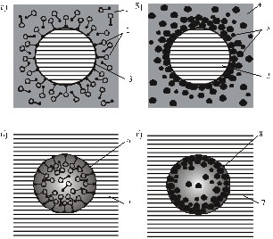 4 – водная суспензия твердого эмульгатора (дисперсионная среда); 5 – частицы твердого эмульгатора; 6 – глобула водного раствора эмульгатора (дисперсная фаза); 7 – битум (дисперсионная среда); 8 – глобула водной суспензии твердого эмульгатора (дисперсная фаза)