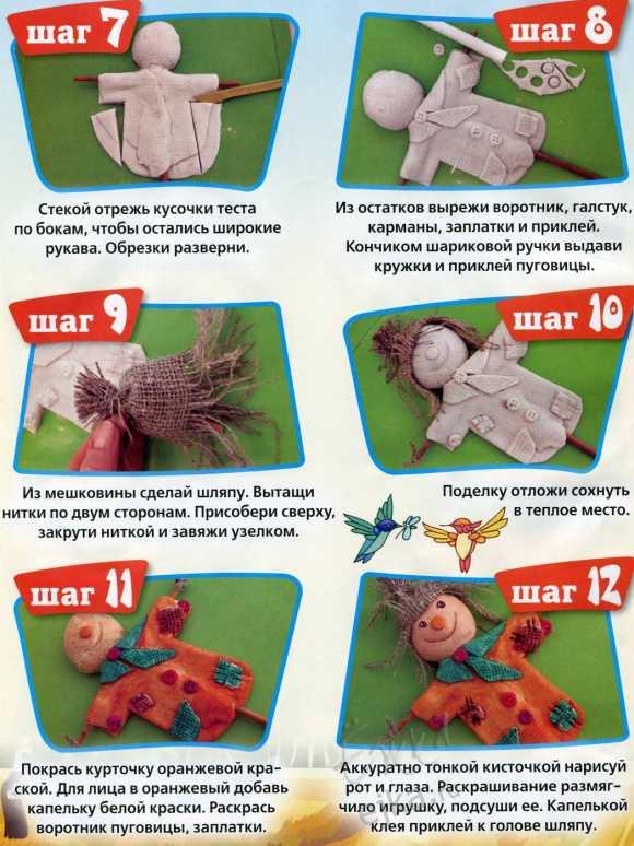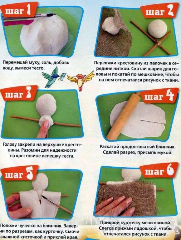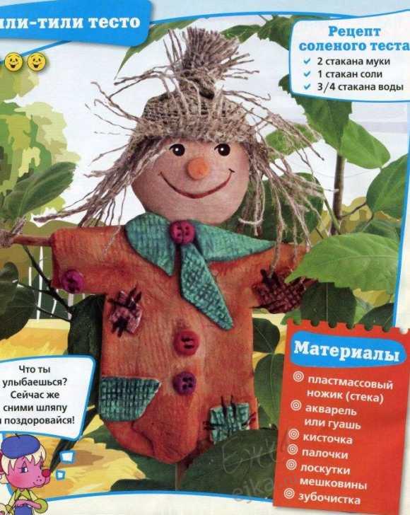Дети очень любят лепить из соленого теста (оно мягче, чем пластилин). Это очень полезное и одновременно приятное занятие. Предложите детям слепить такое чучелко из соленого теста, которое можно приготовить своими руками (рецепт написан на картинках) или же купить в магазине готовое.