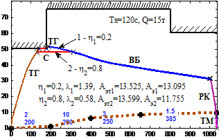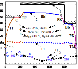 получим пару точек переключений режимов на оптимальной траектории для рассматриваемого режима (ВБ, РК или ТГ): точка переключения на оптимальной траектории из предыдущего режима в рассматриваемый режим и точка переключения на оптимальной траектории из рассматриваемого режима в следующий режим. Например, при