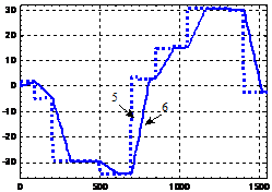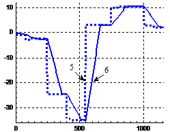 Рис. 8. Траектория движения поезда на перегоне «Caugiay-Kimma» при модели «нерастяжимая нить», рассчитанная по энергооптимальным режимам, полученным на модели «материальная точка»: 1- исходная энергооптимальная траектория, полученная по модели «материальная точка», 2- траектория, рассчитанная по заданным режимам на модели «нерастяжимая нить»; 3, 4- результаты расчета соответственно для траектории 1 и 2; 5, 6- зависимость wg(s) при модели «материальная точка» и «нерастяжимая нить».